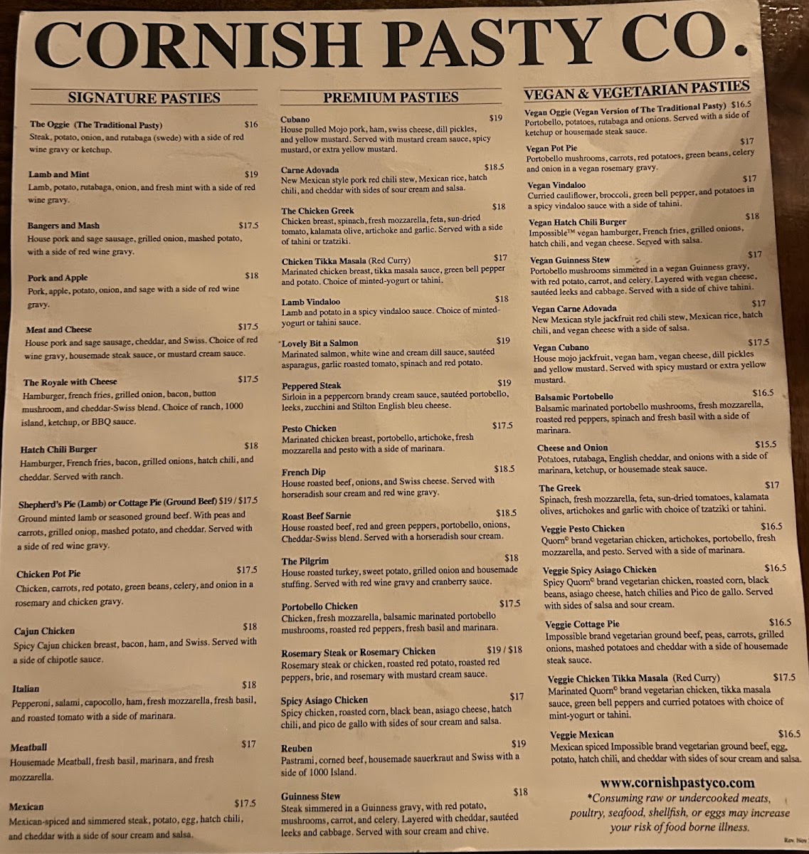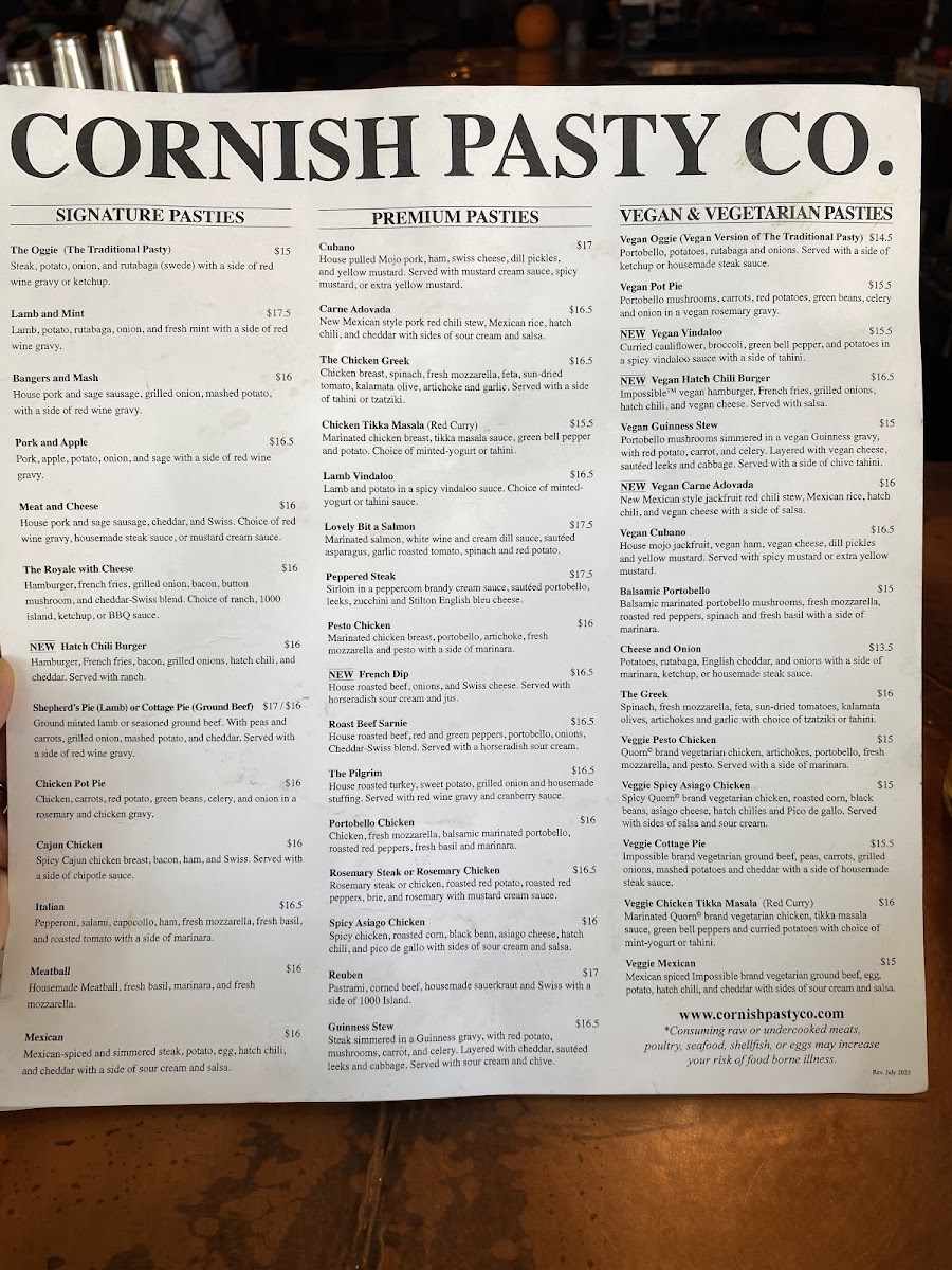 The customer experience at Cornish Pasty Co shines bright, as many have shared their delighted moments. Lane Reed describes the vibe as "cozy with a cool edge," and praises the attentiveness of the staff. Christina Provencio, a long-time fan, revels in the spot’s versatility, stating it's perfect for any occasion. The overwhelmingly positive reviews speak volumes about the impeccable service and the quality fare consistently delivered here.